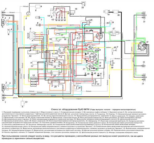 Шема проводки ЛУАЗ 969м включает в себя множество проводов и соединений, что позволяет передавать электро-сигналы и энергию от источника питания к различным устройствам автомобиля.
